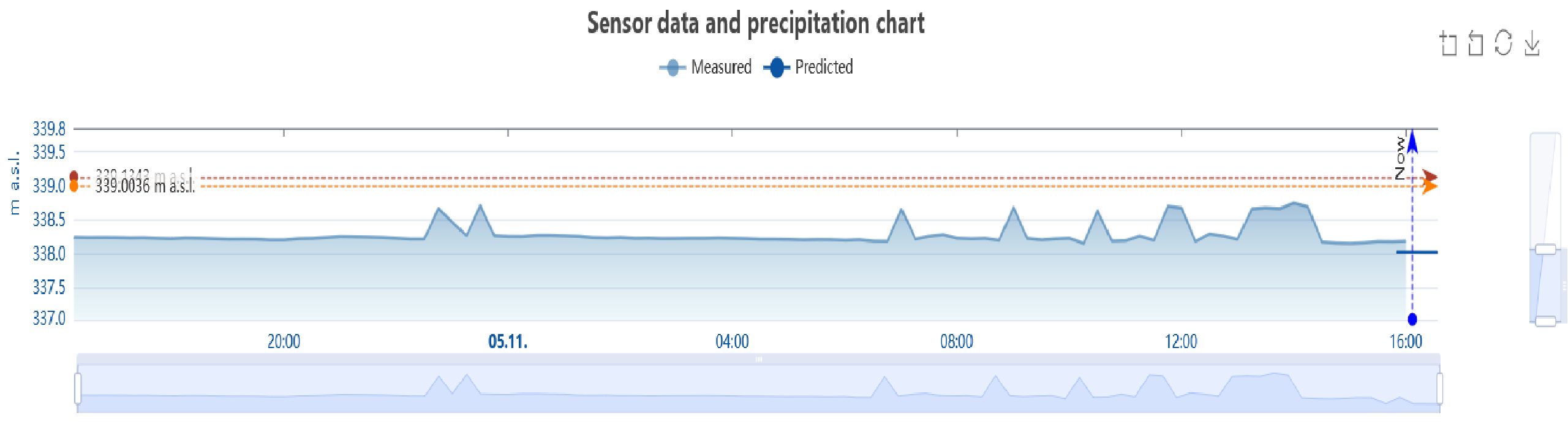 Thresholds are labeled with values in meters above sea level. The chart view can be adjusted using sliders to change the visible time range.