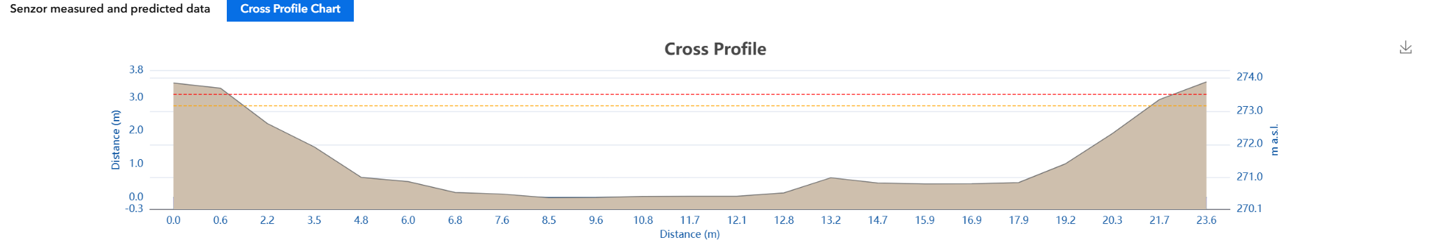 - Cross Profile Chart โ displays terrain across the river, showing water level and alarm lines.