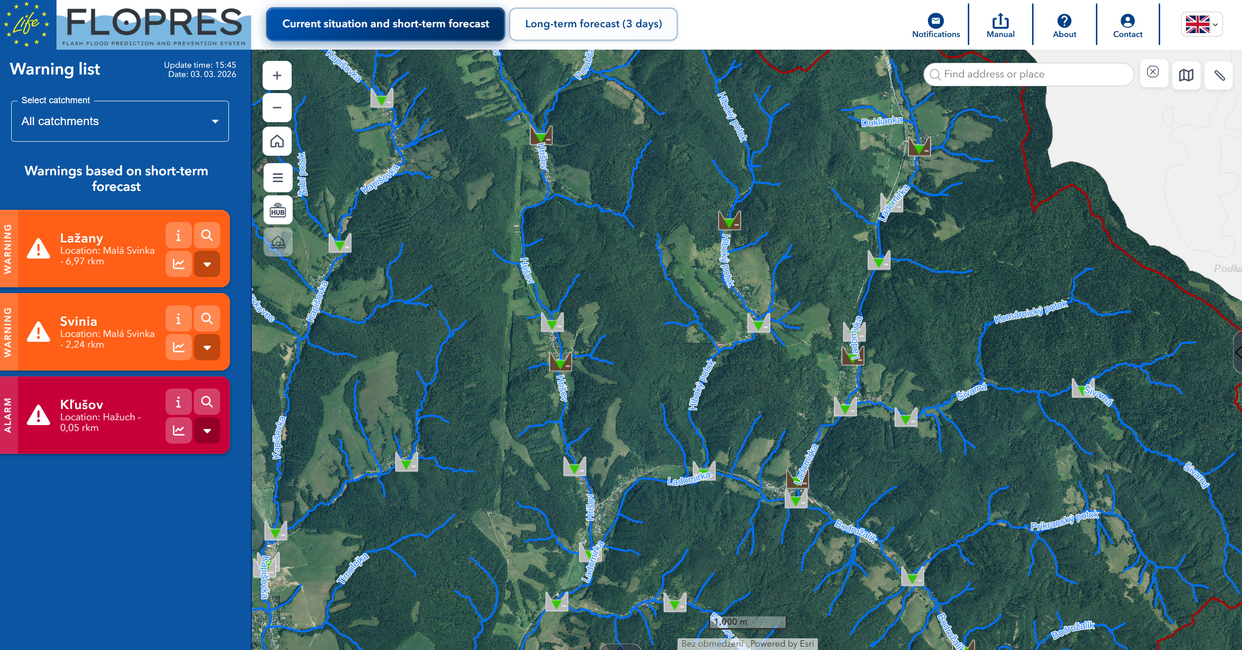 The FLOPRES Early Warning Application is a web-based tool designed to enhance preparedness and response to flash floods in pilot catchments across Poland and Slovakia. It combines real-time IoT sensor data, hydrological models, and meteorological forecasts in one unified platform.