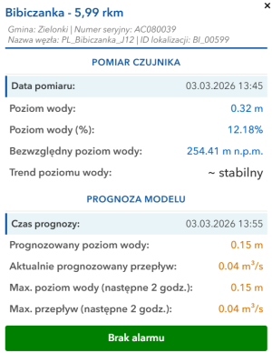 Po najechaniu kursorem na czujnik wyświetlana jest karta informacyjna zawierająca: szczegóły lokalizacji czujnika, pomiary czujnika i prognozę modelu.